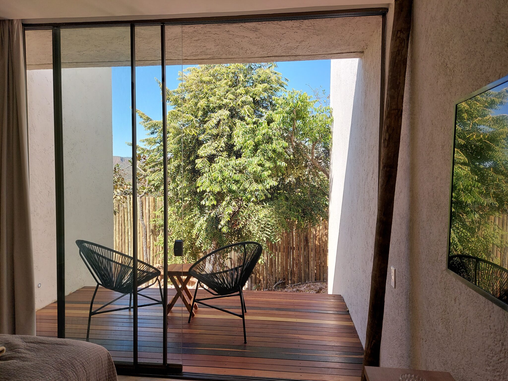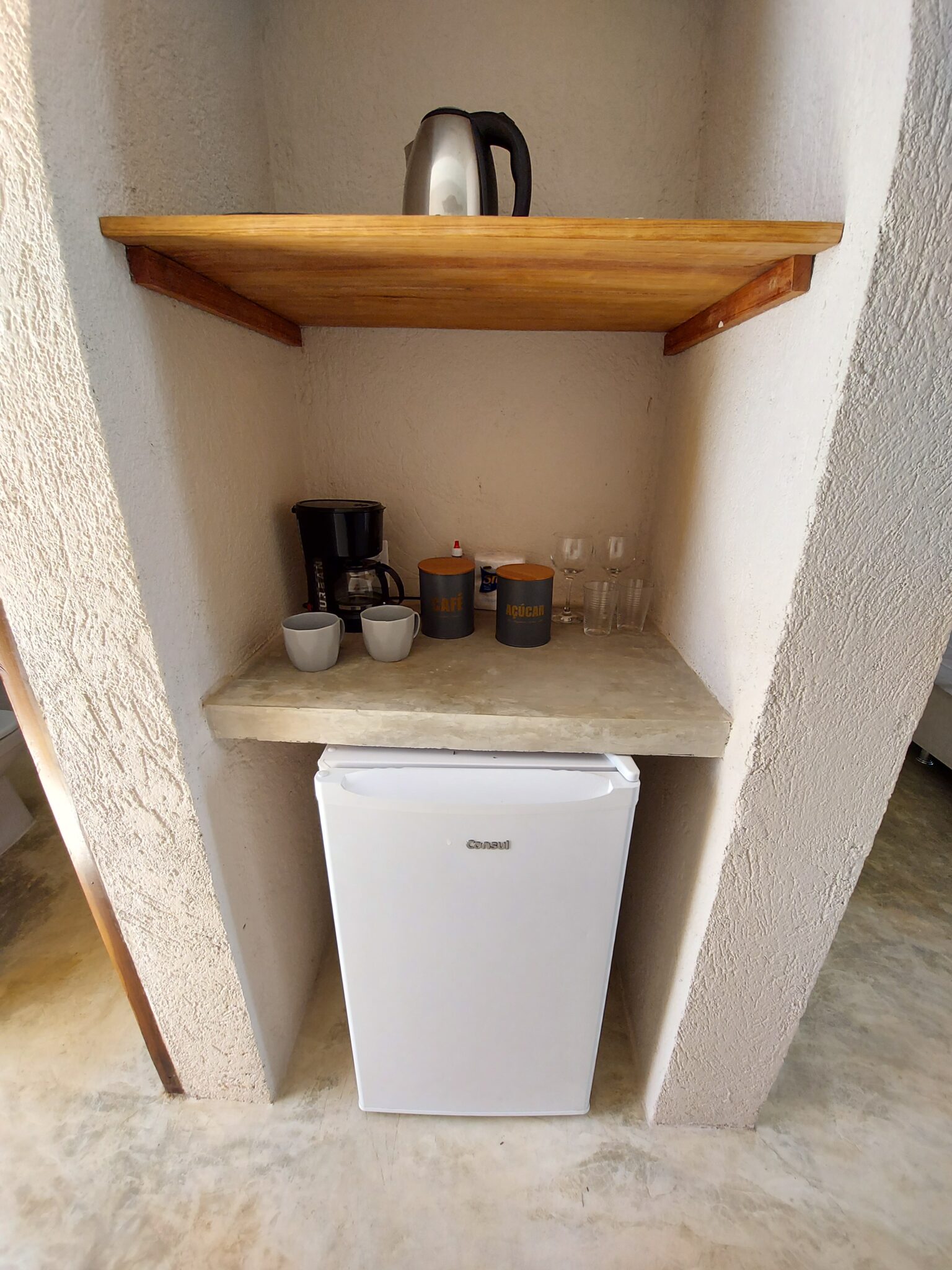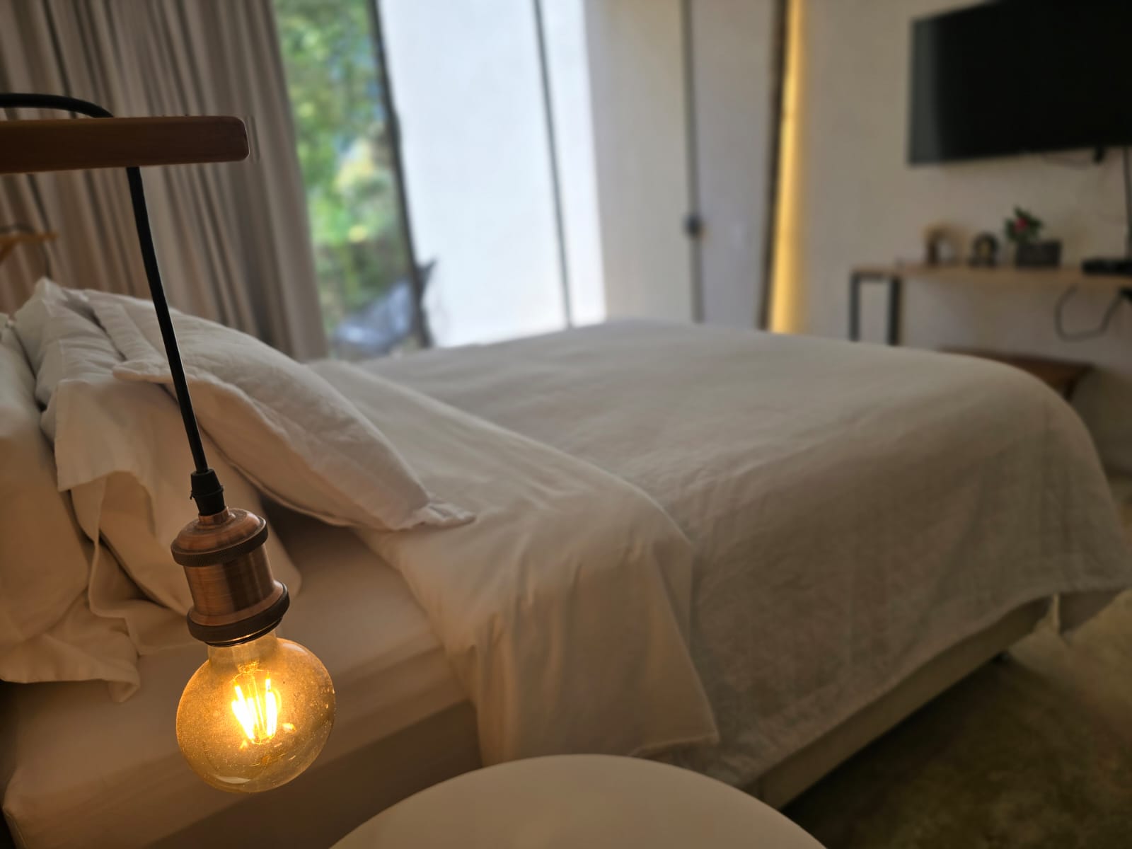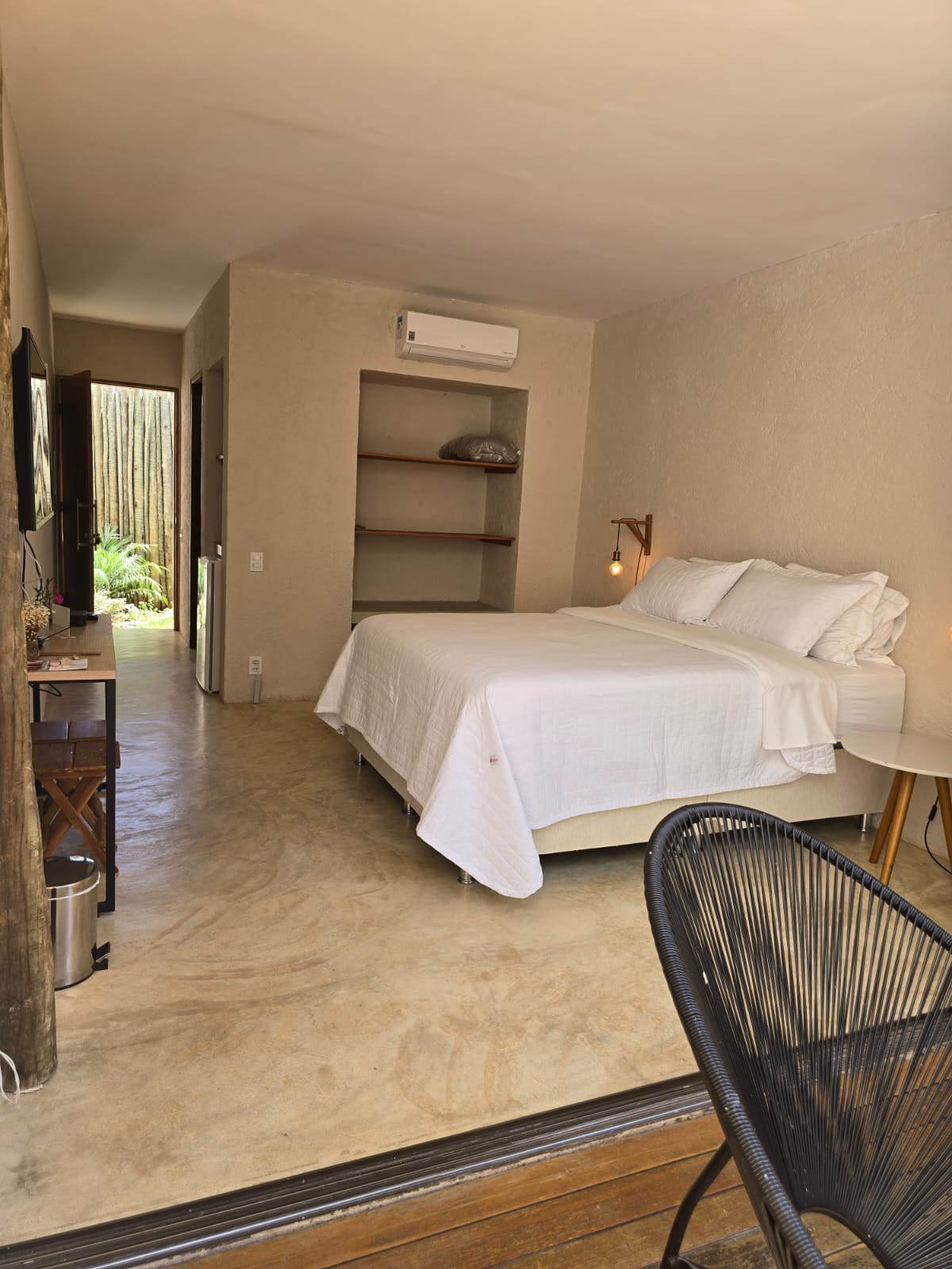 Uma suíte ideal para casais. Possui jardim exclusivo na entrada, cama queen, deck privativo. Equipada com smartv, frigobar, cafeteira elétrica, ar-condicionado, banheiro com chuveiro elétrico. Enxoval completo, lençóis de 1000 fios, toalhas de banho e toalhas para cachoeira.